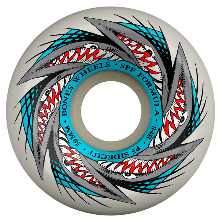 BONES WHEELS Wheel Core: No Wheel Diameter: 58mm Wheel Width: 33mm Wheel Hardness: 84B = 104a Wheel Formula: SPF Wheel Color: White Wheel Suggested Use: Skateparks Wheel Surface: Smooth Wheel Shape: P5