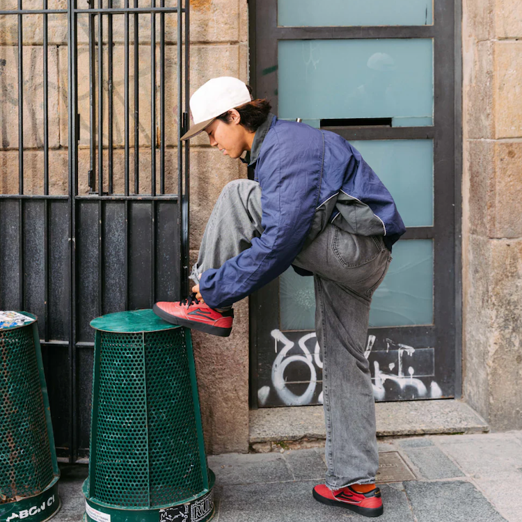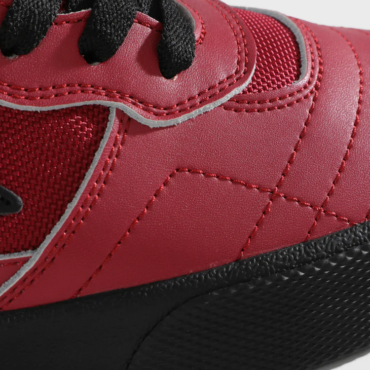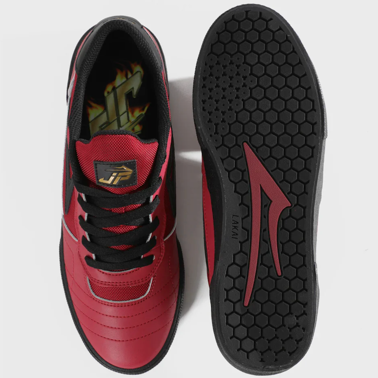 Special Edition Pro Colorway - Jumpei Tsutsumi Scooter Red Black. Reimagined in Jumpei's vision, this Cambridge features a Scooter Red leather upper and breathable mesh. Customized details on the label and upper heel in black leather with gold foil "JP", and sole with gold foil print of "JP" and the Lakai Flare, and flame background.