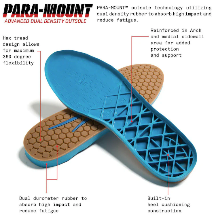 Our advanced PARA-MOUNT™ outsole technology utilizes dual density cushioning to absorb high impact. The Hex-tread design combines 360 degree flexibility for increased board feel and maximum grip. Reinforced in the arch area for added protection and support.