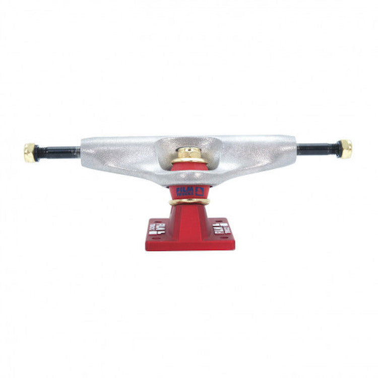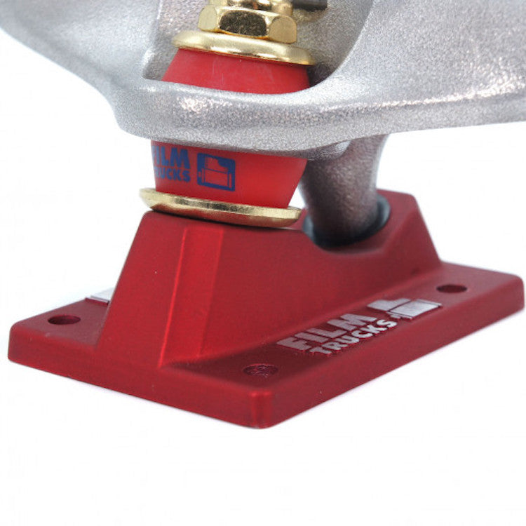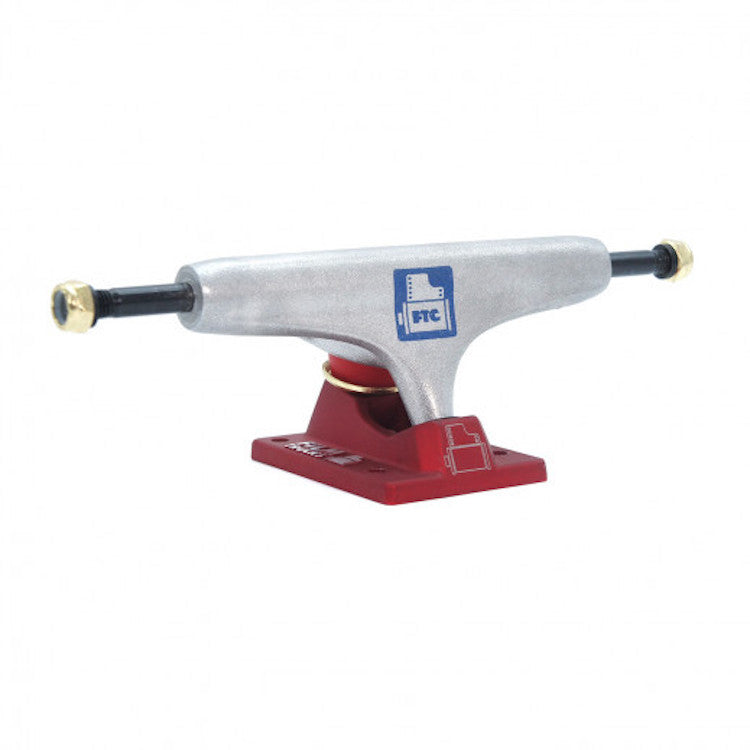 Machine polished truck with low gloss finish, burgundy anodized base, gold bolts and screen printed FTC x FILM logo on the hanger.